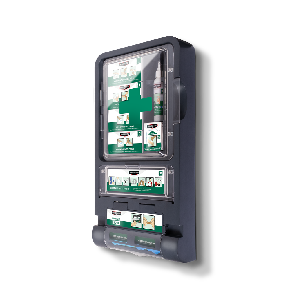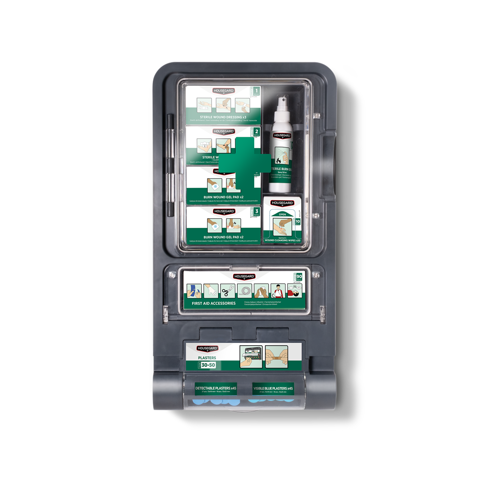 Kattava ensiapuasema haavojen ja palovammojen ensiapuun. Soveltuu ravintoloihin, suurkeittiöihin ja pienille työpaikoille, joissa on palovammariski.